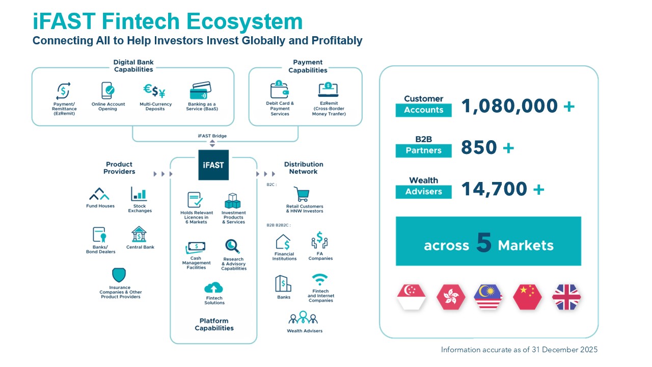 iFAST Corporation is a global digital banking and wealth management platform, with assets under administration of approximately S$31.98 billion as at 31 December 2025. Incorporated in the year 2000 in Singapore, iFAST Corp provides a comprehensive range of investment products and services to financial advisory firms, financial institutions, banks, multinational companies, as well as retail and high net worth investors. The Group offers access to over 28,300 investment products including unit trusts, bonds and Singapore Government Securities, stocks and exchange traded funds (ETFs), insurance products, and services including wealth management solutions, banking services, pension administration, research and investment seminars, fintech solutions, banking, and investment administration and transaction services. The company is also present in Hong Kong, Malaysia, China and UK.